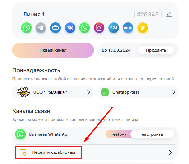 2. Зайдите в линию с подключенным WABA и нажмите «Перейти к шаблонам».