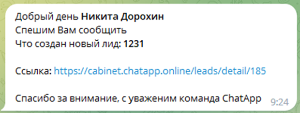 4. При появление нового лида в личном кабинете ChatApp на привязанный Telegram придет сообщение: