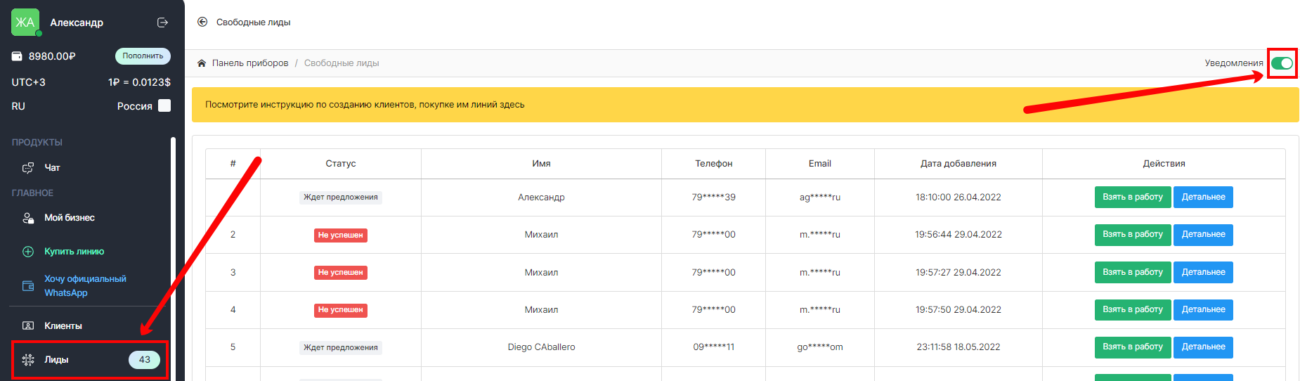 - В личном кабинете в разделе Мои лиды включите уведомления: