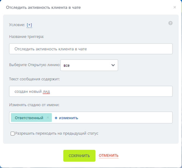 6. Перейдите в раздел Роботы, нажмите «Создать» и найдите триггер «Отследить активность клиента в чате». Дважды кликните по триггеру и перейдете в настройки триггера. В окне «Текст сообщения содержит» введите «создан новый лид»