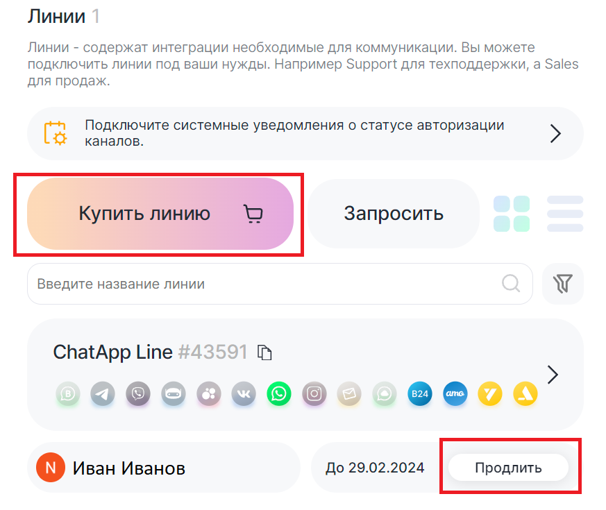 3. Нажмите «Купить линию» или «Продлить» возле купленной линии.