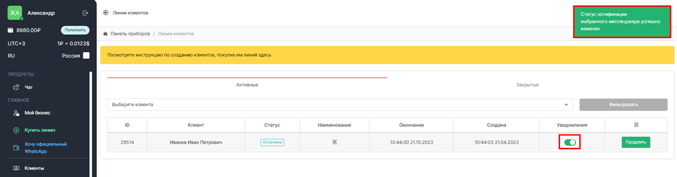- В личном кабинете в разделе «Линии клиентов» включите «уведомления»: