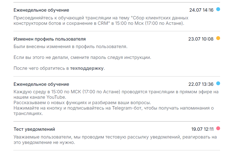 - Системные уведомления — о статусах каналов и линий, авторизации, смене пароля, изменениях профиля. Выделяются жёлтым цветом