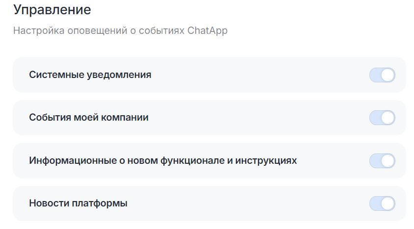 Уведомления о разных типах событий приходят в Личный кабинет, Telegram и другие мессенджеры, по Email и в виде Push-уведомлений. С помощью уведомлений можно узнать о изменении статусов каналов и линий, событиях компании, новом функционале, новостях и мероприятиях ChatApp.