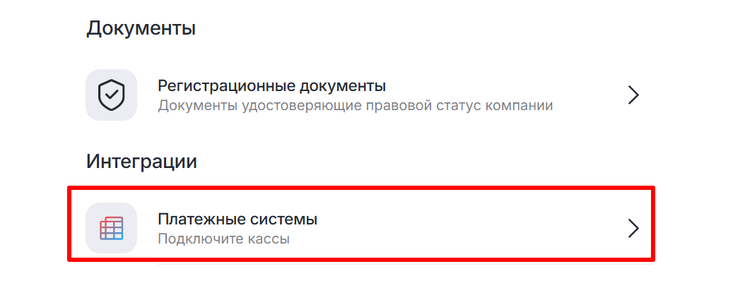 - В разделе «Интеграции» выберите пункт «Платежные системы».