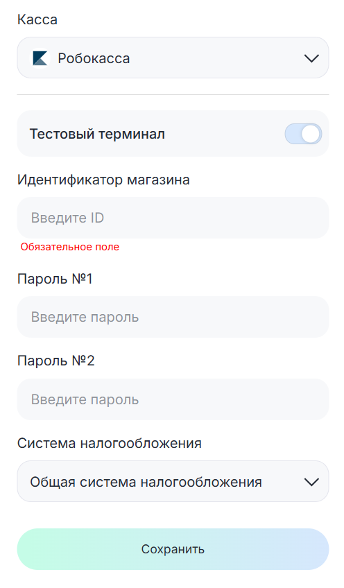 - Идентификатор магазина или ID терминала — введите ID магазина для Робокассы или терминала для Т-банка;