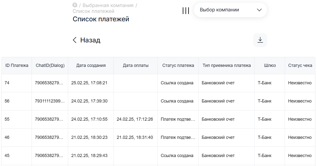 После проведения платежа, информация о нем будет отображена на странице «Список платежей». Для просмотра списка платежей нажмите «Выбранная компания» — «Платежные системы» — «Список платежей».