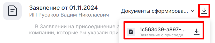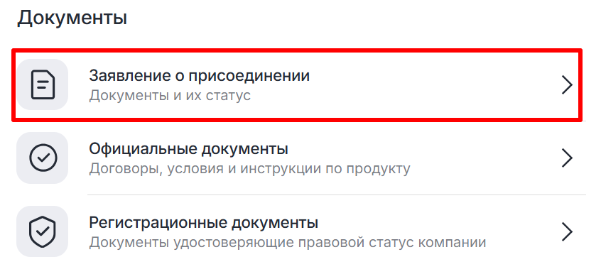 - Нажмите «Заявление о присоединении» в разделе «Документы».