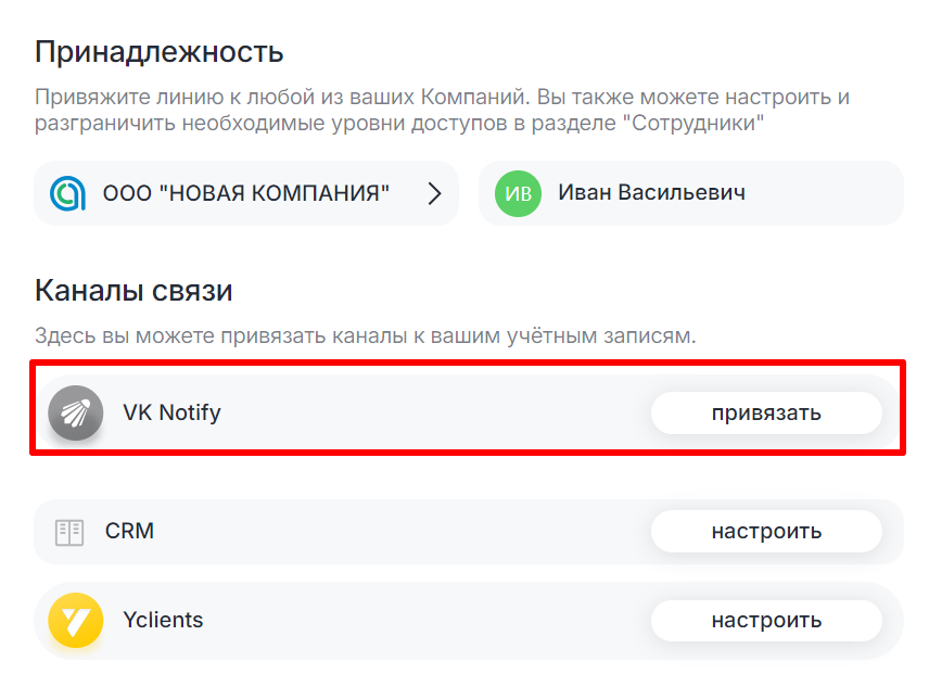 Важно: если на линии есть VKNotify, то добавить эту линию в другие компании не получится.