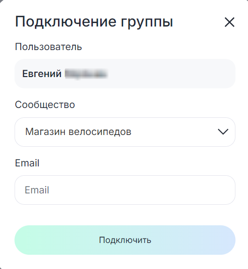 - Выберите аккаунт ВКонтакте, сообщество и укажите Email — на него будут приходить уведомления о статусах шаблонов. Нажмите «Подключить».