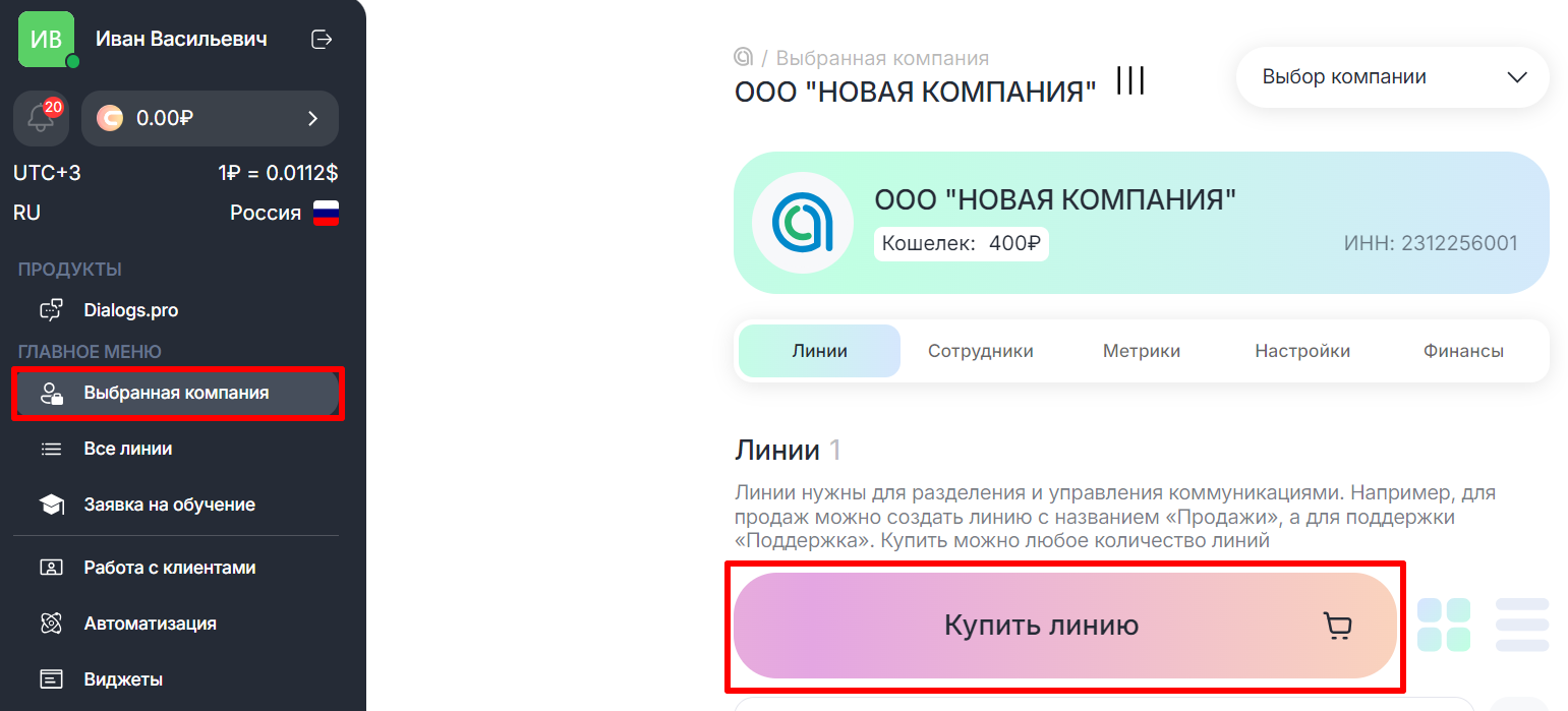 - В разделе «Выбранная компания» — «Линии» нажмите «Купить линию».