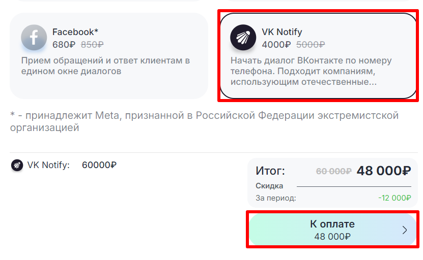 Важно: канал VK Notify можно купить только для юрлица РФ.