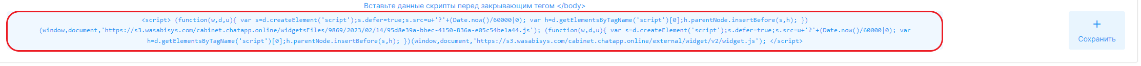 После сохранения, в нижнем поле редактирования виджета отобразятся данные скрипта, которые нужно скопировать и вставить в код страницы вашего сайта.