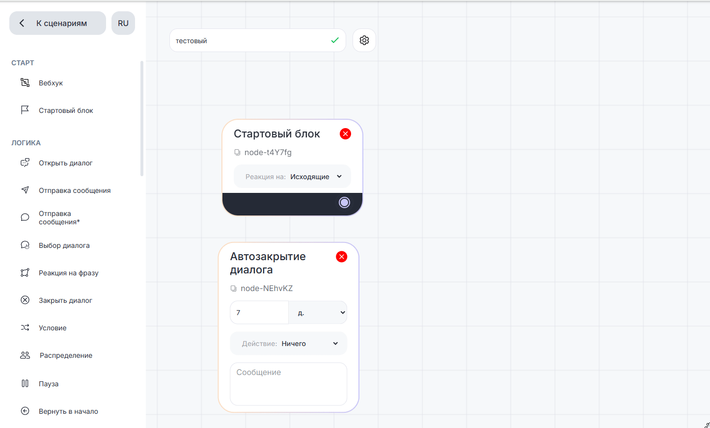 В Scenario Dialogs чат по умолчанию находится в закрытом состоянии. Блок «Открыть диалог» используется для перевода чата в открытое состояние, при котором сотрудники могут вести переписку с клиентом.