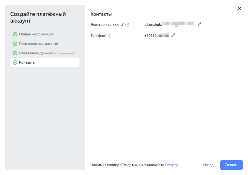 8. Создайте платежный аккаунт, введите персональные, платежные данные и контакты и нажмите на «Создать».
