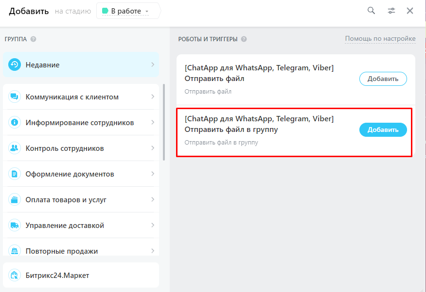 3. Чтобы после отправке файла, ответственный за сделку получил уведомление, настройте дополнительного робота из стандартного набора Битрикс24. Так вы сможете узнать, если при отправке возникла ошибка.