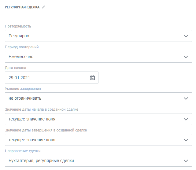 Чтобы акты автоматически создавались и рассылались каждый месяц, используйте регулярные сделки. Порядок создания регулярной сделки см. в справке Битрикс24.
