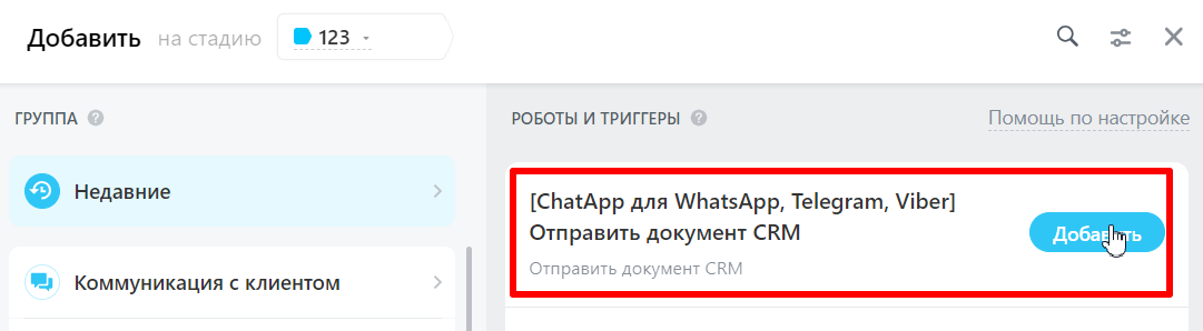 - В сделке нажмите Роботы и на нужной стадии нажмите на кнопку Добавить (+).