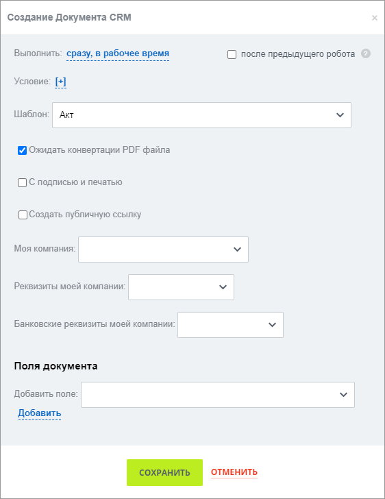 - После предыдущего робота — обязательно включите этот параметр. Перед тем как отправлять акт, нужно дождаться, когда первый робот создаст документ;