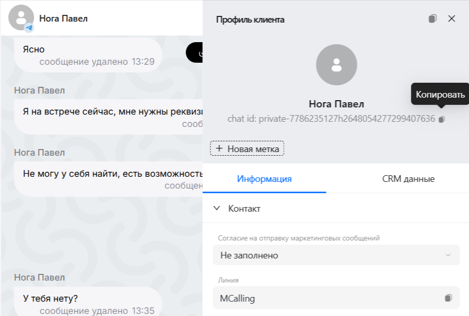 Его можно взять, например, из чата Scenario Dialogs. Для этого нажмите на иконку собеседника в нужном диалоге и скопируйте «Chat ID».