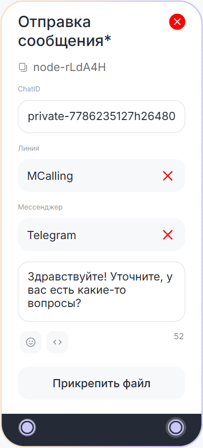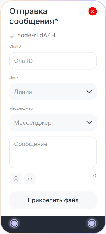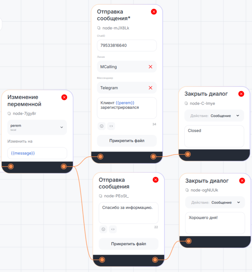 Блок «Отправка сообщения*» в диалоговом сценарии может понадобиться, например, чтобы при регистрации клиента отправить сотруднику в чат уведомление.