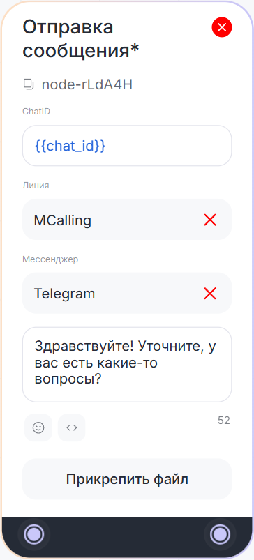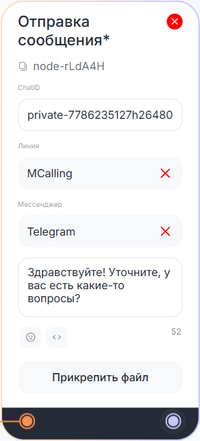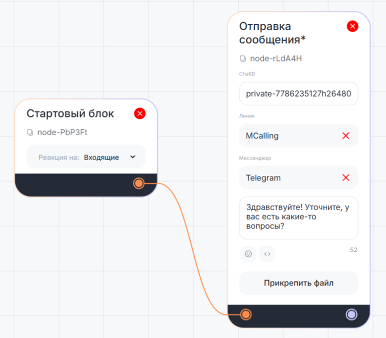 В диалоге бота с клиентом блок «Отправка сообщения*» автоматически отправляет сообщение.
