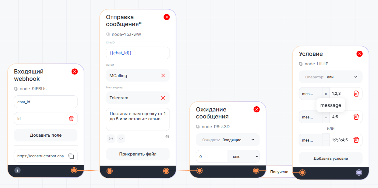 От обычного блока «Отправка сообщения» (без звездочки «*») он отличается тем, что может реагировать на получение запроса через вебхук.