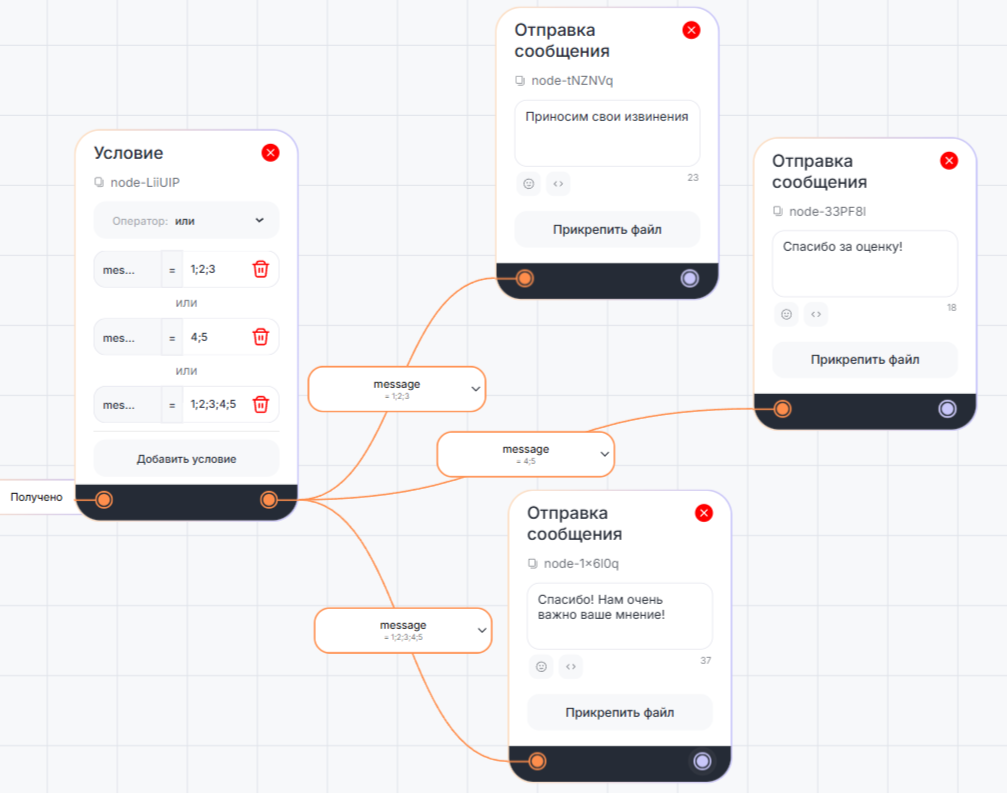 2. В блоке «Условие» указаны три варианта развития сценария в зависимости от выставленной клиентом оценки.