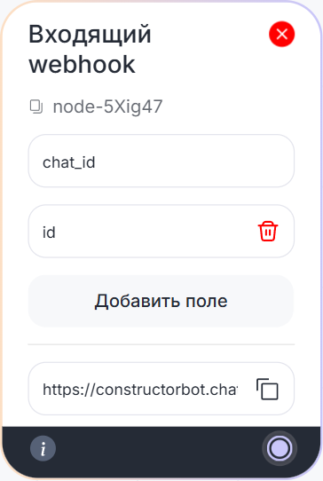 2. Создайте поля и добавьте параметры, которые будут передаваться. Например, создадим два поля chat_id — номер телефона, email или username клиента и id — идентификатор карточки CRM.