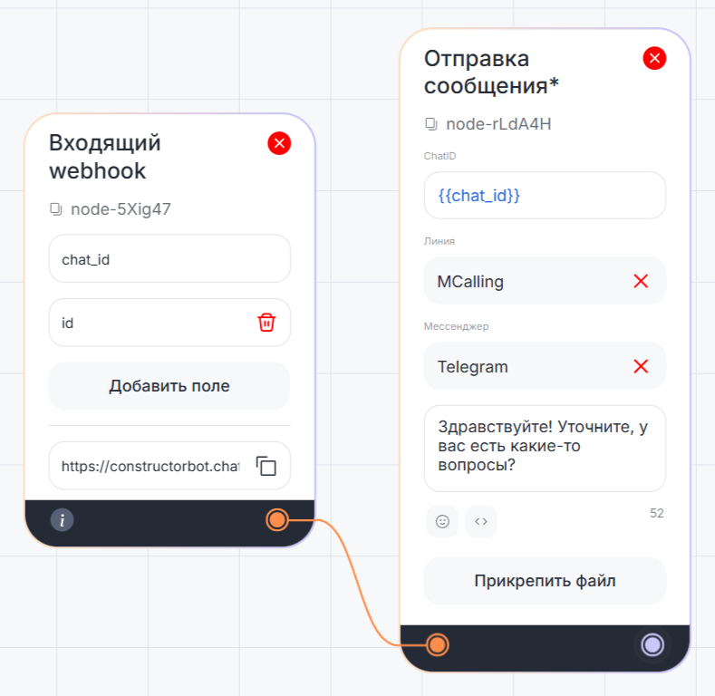В сценарии с реакцией на запрос вебхук «Отправка сообщения*» используется с блоком «Входящий webhook». Например, если нужно отправить сообщение при перемещении карточки в CRM-системе. В таком сценарии блок «Входящий webhook» автоматически передает значение в поле «ChatID» из CRM-системы через переменную.