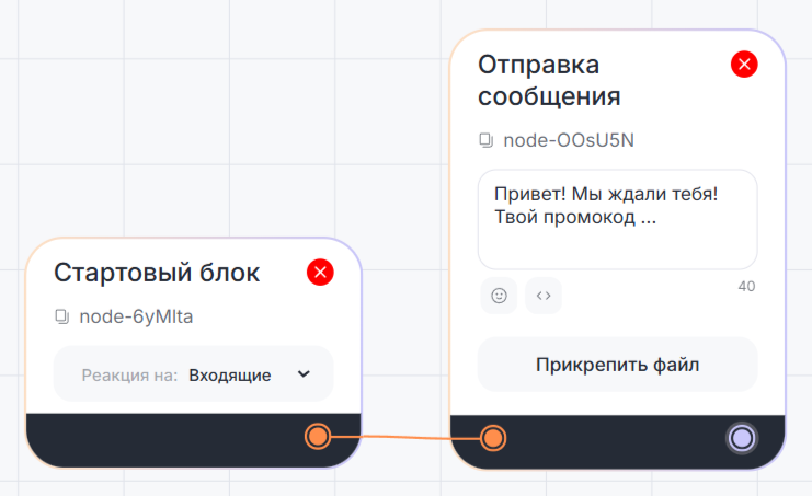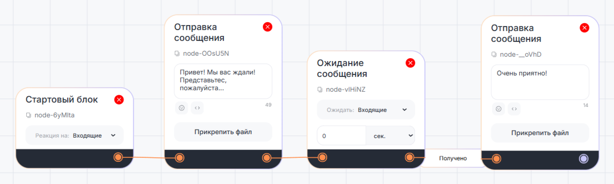 Блок «Отправка сообщения» срабатывает сразу — если поставить несколько блоков в ряд, все сообщения отправятся одновременно. Чтобы сделать сценарий диалога с клиентом, соедините блоки «Отправить сообщение» блоком «Ожидание сообщения» — ответы бота будут приходить после получения сообщения клиента.