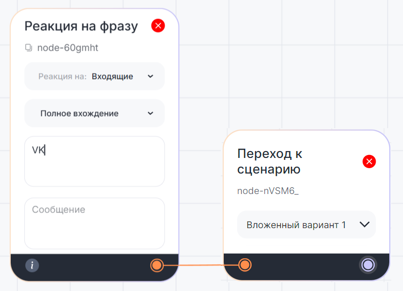 - Блок «Реакция на фразу» в логике переходов между сценариями работает только внутри вложенного сценария.