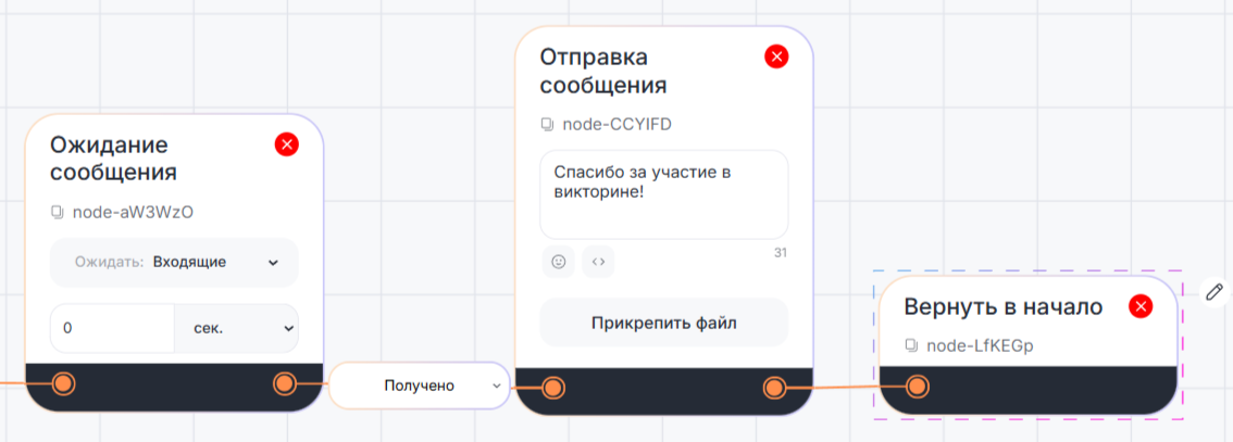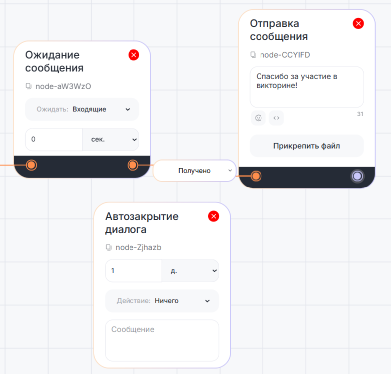 1. Блоки «Закрытие диалога», «Автозакрытие диалога» и отправка команды /start после выполнения вложенного сценария переведут бот в начало основного. Если их нет, бот перейдет в предыдущий сценарий любого типа — вложенный или основной (см. пункт 4).