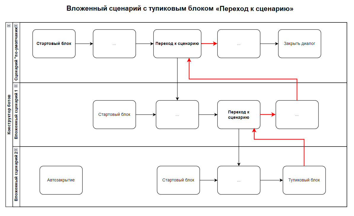 4. Блок «Переход к сценарию» может быть тупиковым. Тупиковый блок имеет выход, но он не соединен со следующим блоком. При достижении тупикового блока во вложенном сценарии, бот вернется к выполнению блока «Переход к сценарию» в предыдущем сценарии любого типа — вложенном или основном.