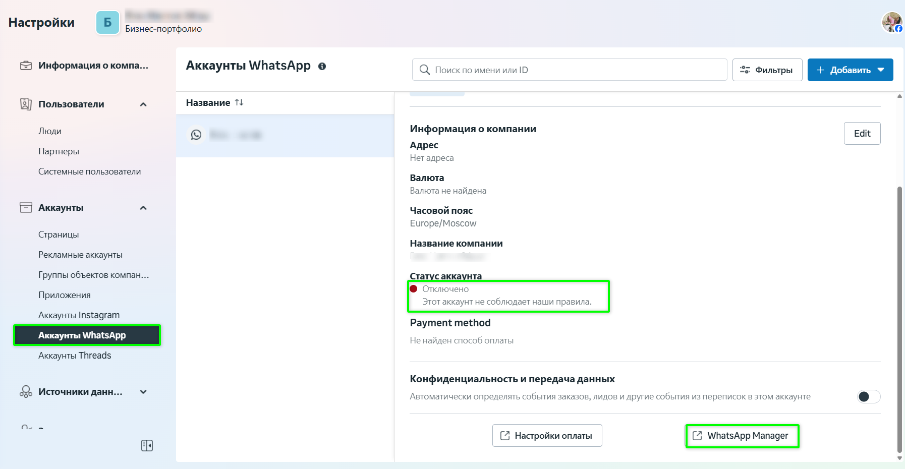 Если аккаунт заблокирован, в Meta Business Suite в настройках компании по пути
