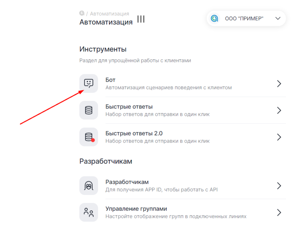 2. В меню слева зайдите в раздел «Автоматизация» — «Бот»;