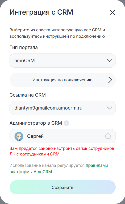3. В поле «Ссылка на CRM» выберите ваш аккаунт в amoCRM.
