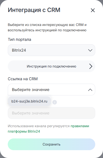 3. В поле «Ссылка на CRM» выберите ваш аккаунт в Bitrix24.
