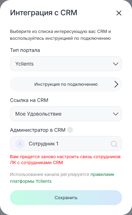 3. В поле «Ссылка на портал» выберите филиал Yclients/Altegio.