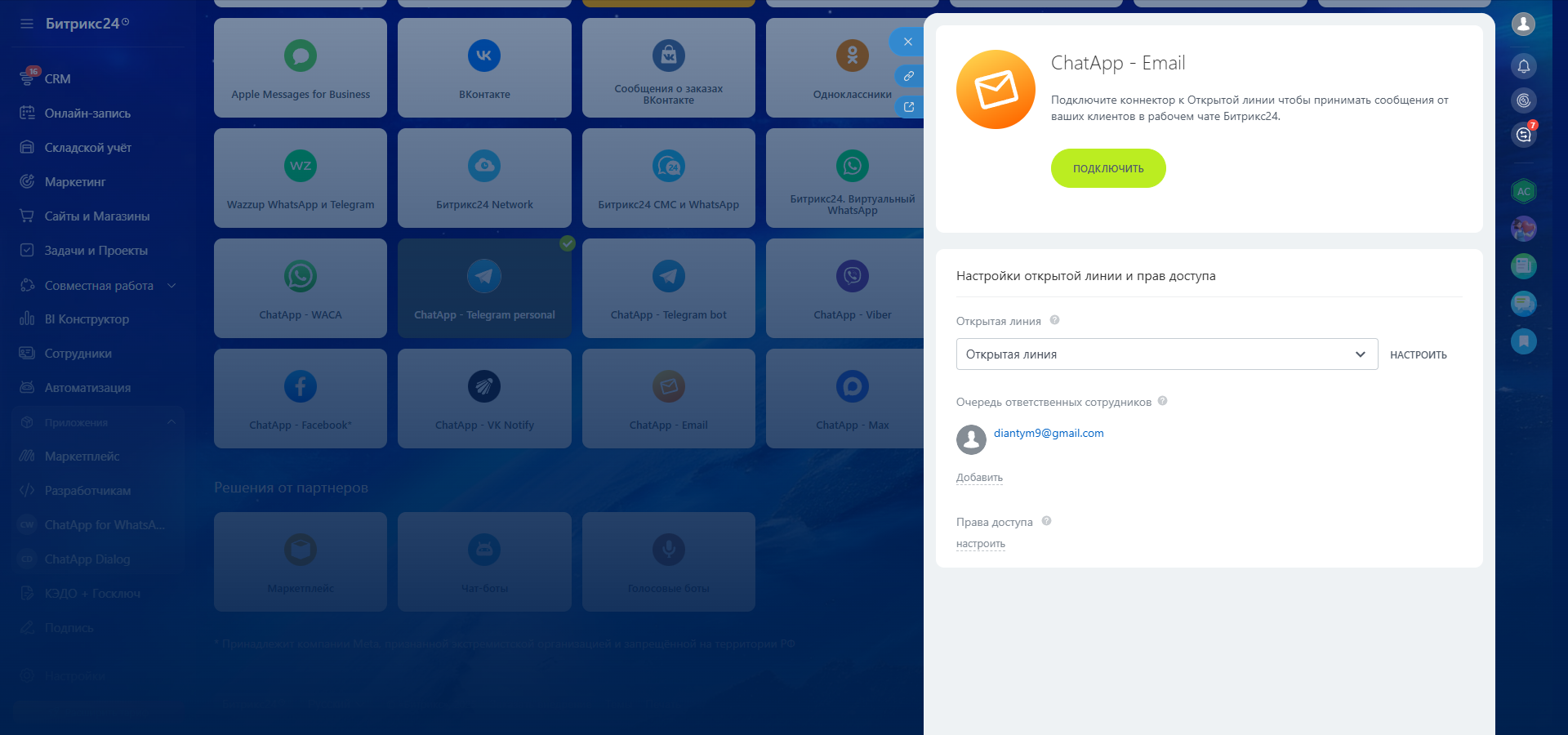Подключите коннектор «ChatApp — Email», чтобы оставаться на связи с клиентами в открытых линиях Битрикс24.