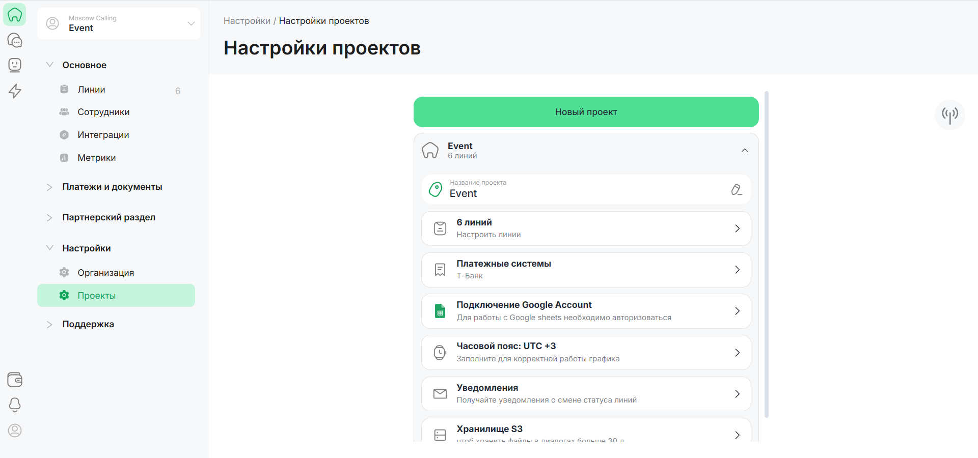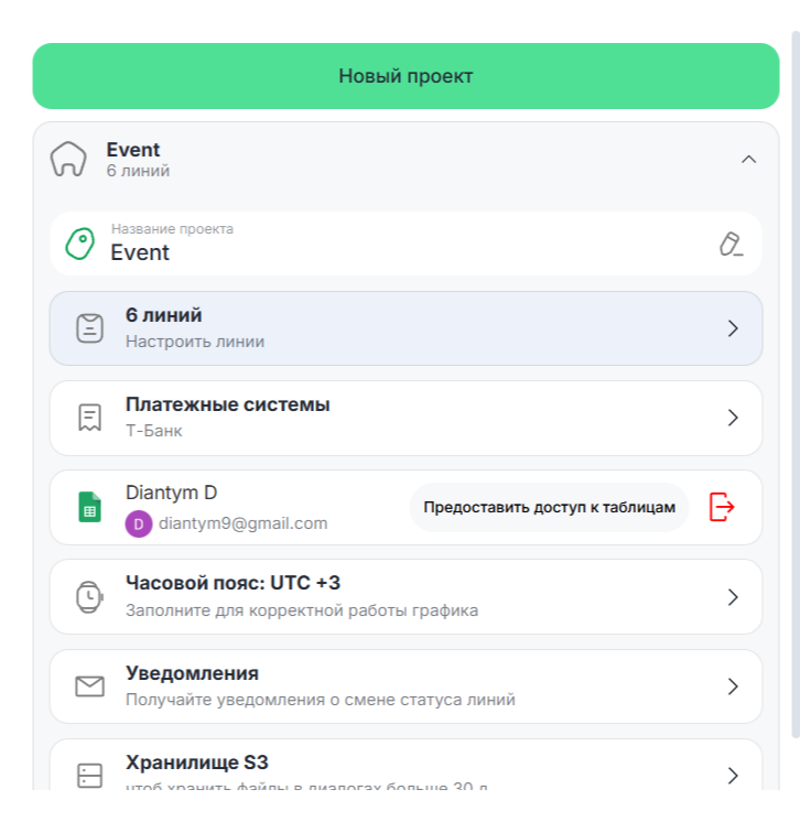 1. В верхней части левого сайдбара страницы Личного кабинета в выпадающем списке выберите Организацию и Проект, для которого подключаете Google Sheets.