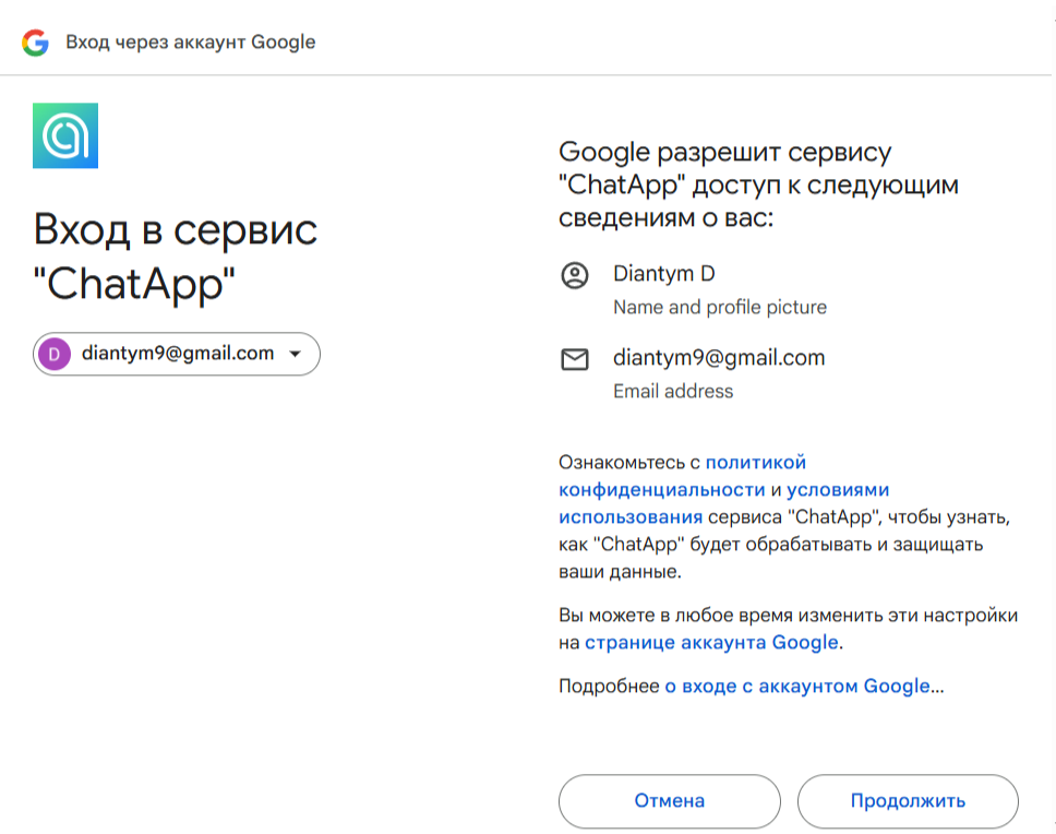 5. Разрешите доступ ChatApp к аккаунту нажатием на кнопку «Продолжить».