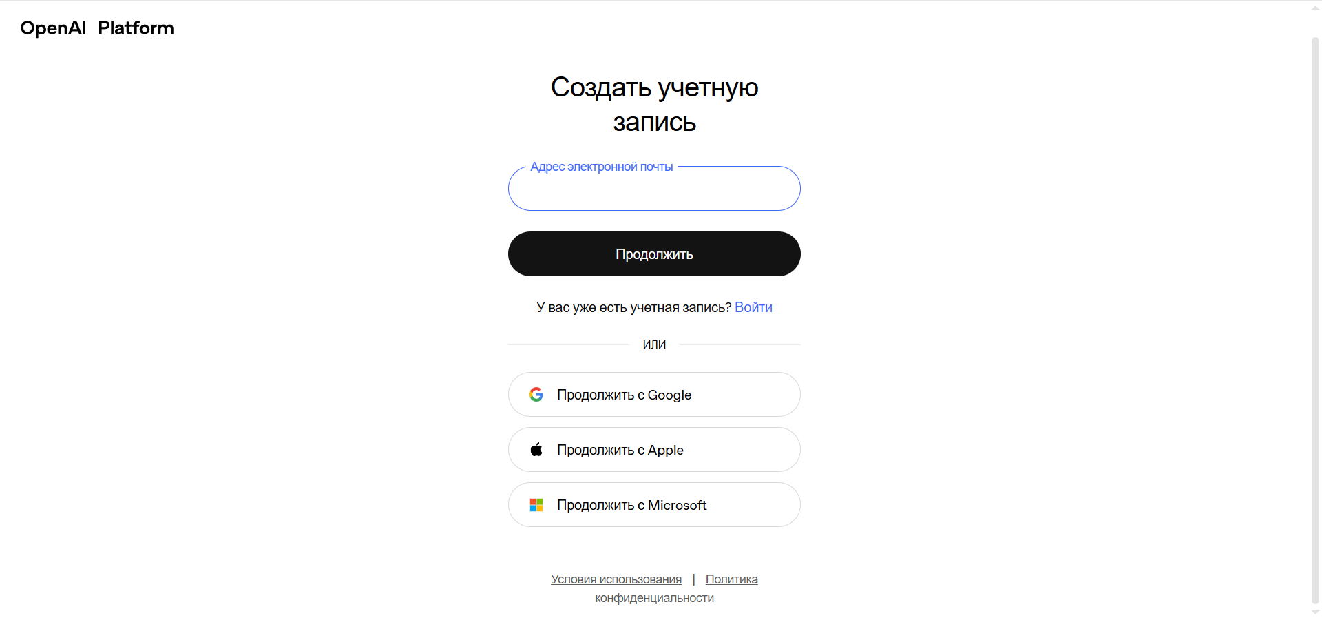 1. Зарегистрируйтесь в OpenAI. Для этого зайдите на сайт platform.openai.com и нажмите на Sign Up.