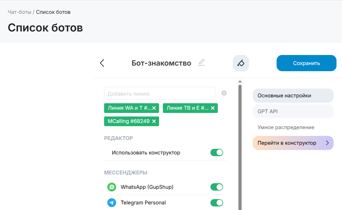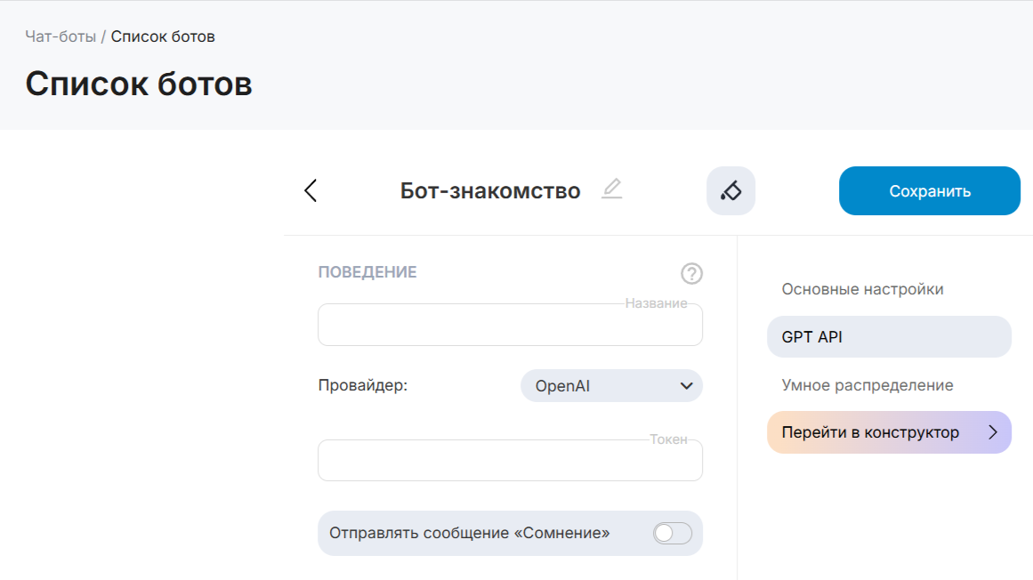 Теперь можно использовать GPT в Конструкторе ботов, а также обучить искусственный интеллект на Быстрых ответах и по файлу jsonl.
