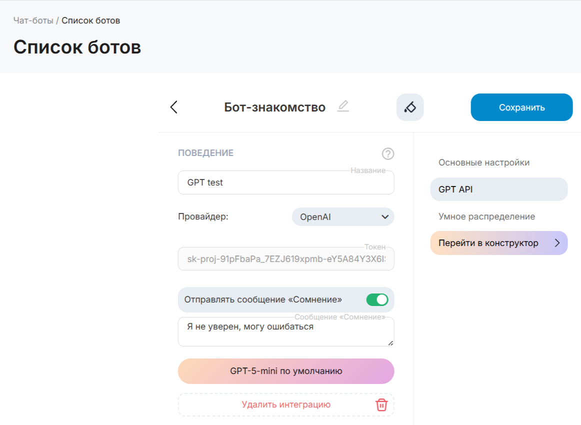 5. Заполните основные параметры и вставьте ключ API из OpenAI в поле Токен. Сохраните настройки.