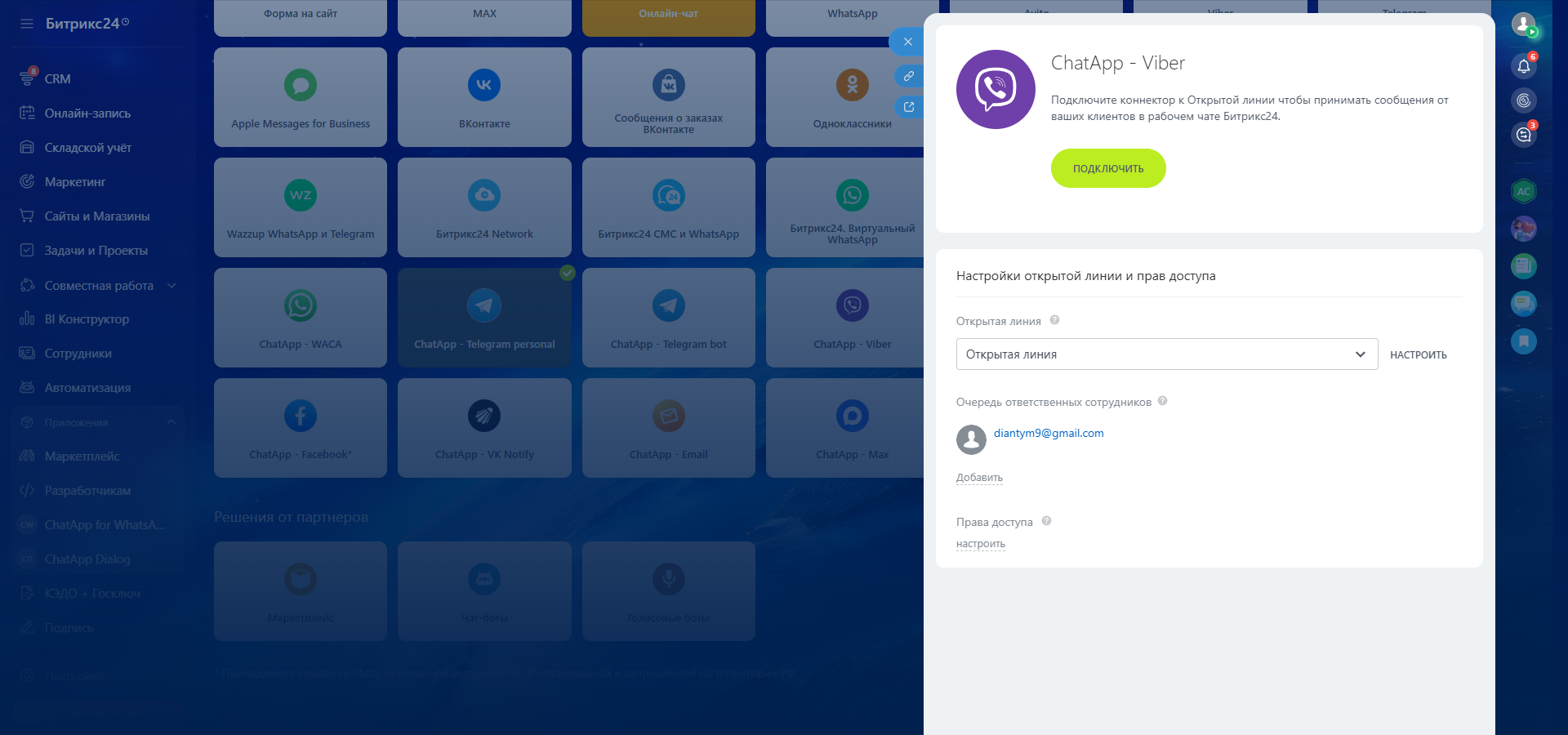 Чтобы оставаться на связи с клиентами в Открытых линиях Битрикс24, подключите коннектор ChatApp — Viber.