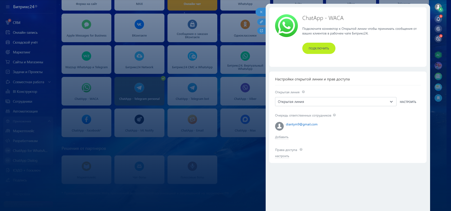Чтобы оставаться на связи с клиентами в Открытых линиях Битрикс24, подключите коннектор ChatApp — WACA.