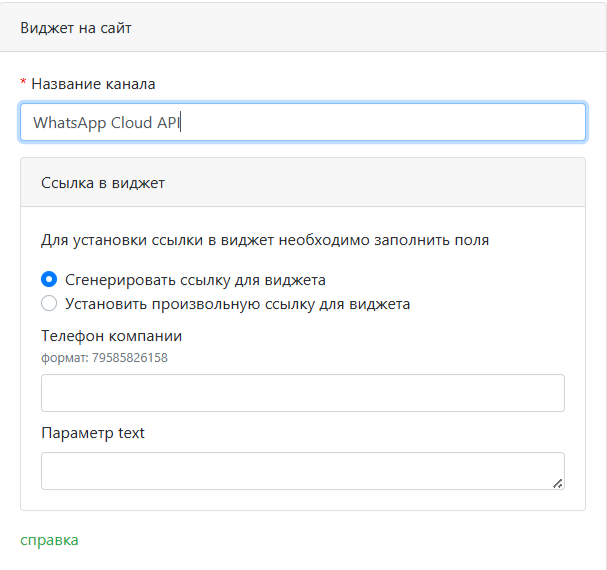 - Виджет на сайт — удобное для вас название канала и ссылка на виджет на вашем сайте для быстрой коммуникации клиентов с вами.