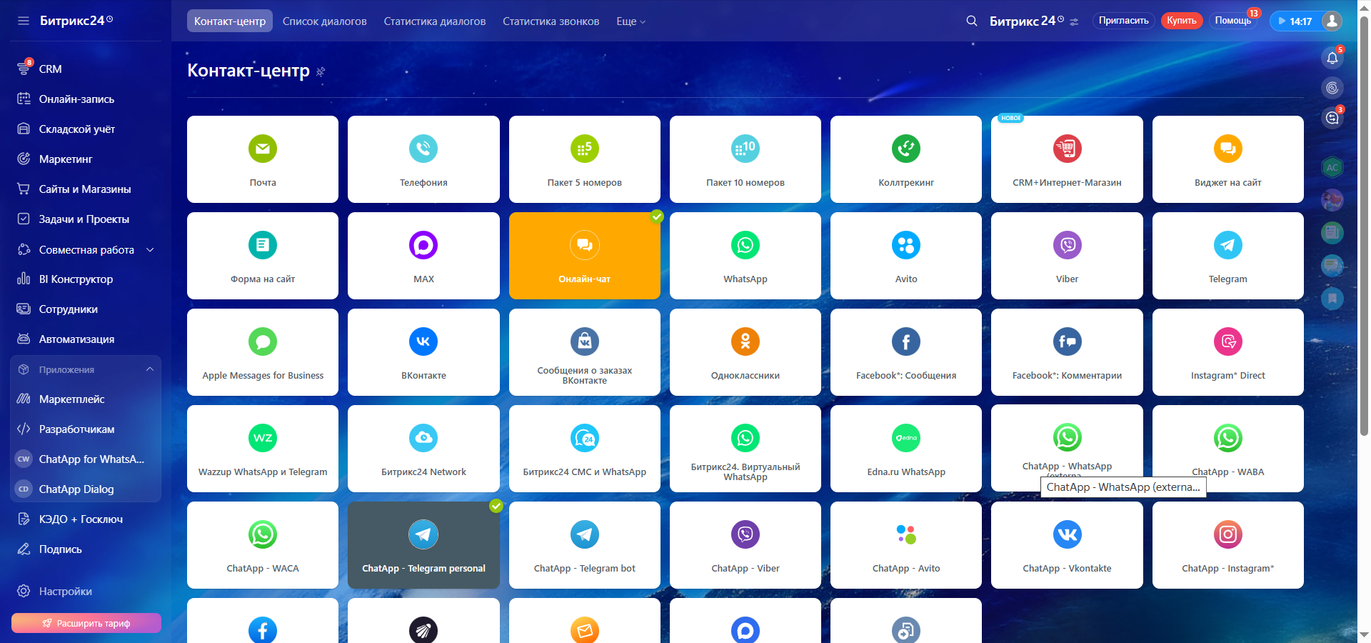 1. Зайдите в Контакт-центр Битрикс24 и выберите коннектор «ChatApp — WhatsApp (external provider)».