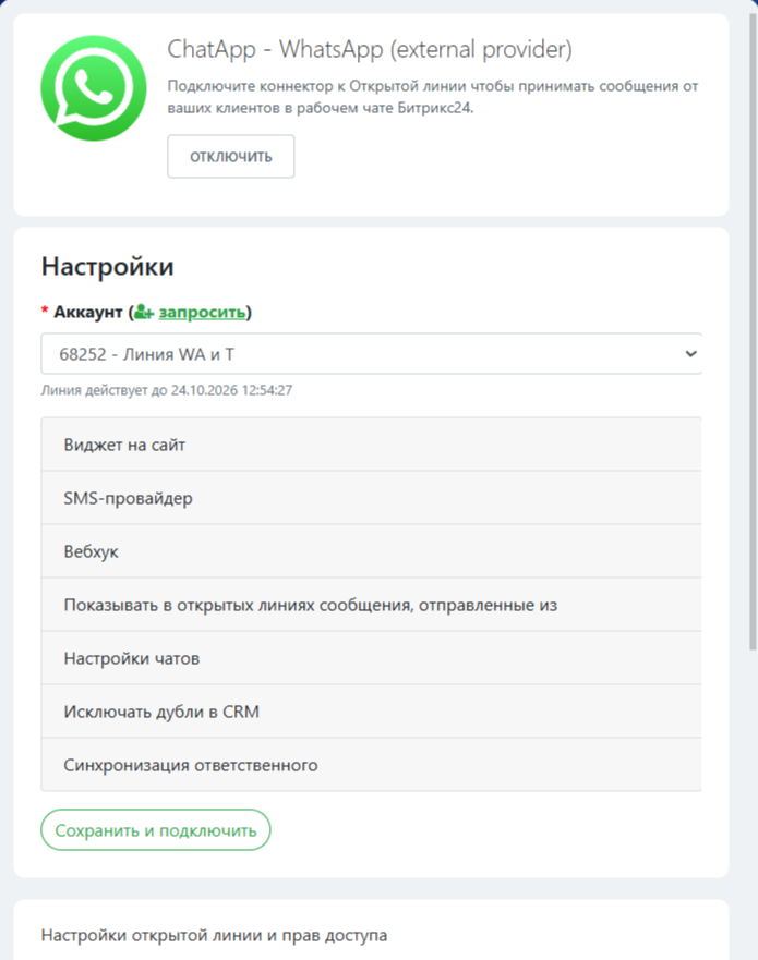 Убедитесь, что в Личном кабинете ChatApp подключен канал WhatsApp, а в Битрикс24 установлен виджет ChatApp.